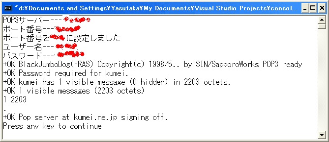 +OK n visible message(xxxx octets) 1 xxxxx 2 xxxxx 3 xxxxx .というような返事が来ます。 最後は「.\r\n」です。 これを受信するまでrecv関数を繰り返して呼び出さなくてはいけません。