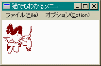 MYMENU MENU DISCARDABLE BEGIN POPUP "ファイル(&File)" BEGIN MENUITEM "終了(&X)\tCtrl+X", IDM_END END POPUP "オプション(&Option)" BEGIN MENUITEM "猫の絵表示(&C)\tShift + F1", IDM_CAT MENUITEM "絵の消去(&D)\tShift + F2", IDM_CLR END END