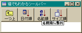 リソーススクリプトです。ボタンにつけるテキストと、 ツールチップで表示する説明をストリングテーブルにしてあります。// tltxt02.rc #include <windows.h> #include "tltxt02.h" /////////////////////////////////////////////////////////// // // String Table // STRINGTABLE DISCARDABLE BEGIN IDS_PARENT "一つ上" IDS_DATE "日付順" IDS_NAME "名前順" IDS_SIZE "サイズ順" IDS_TIPS_PARENT "一つ上のフォルダに移動" IDS_TIPS_DATE "日付順に整列" IDS_TIPS_NAME "名前順に整列" IDS_TIPS_SIZE "ファイルのサイズ順に整列" END